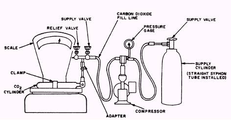 Figure 8-3.-CO2 recharging schematic. Now that you have inspected the CO2 cylinder, you are ready to recharge the bottle. Figure 8-3 shows a recharging setup. Notice in the figure that you need scales, a recharge pump, a supply cylinder, and the necessary lines and valves. Proceed as follows: 1. Place the CO2 cylinder on the scales. NOTE: An accurate scale with a capacity of 100 pounds is necessary. The scale should have 1/100 pound graduations. 2. Weigh and record tare weight (empty weight of cylinder, valve and cable assembly) of the inflation assembly. 3. Install proper charging adapter on the inflation assembly. 4. Secure the inflation assembly to the weighing pan located on the scales before applying any pressure to the cylinder being recharged. 5. Open the supply cylinder valve, fill line valve, and relief valve. This is done to purge (get the air out of) the complete line. Once the line is purged, close the fill line valve and the relief valve. You must be careful when purging the line; you are dealing with a high pressure. If you do not secure the fill line before you apply pressure, the line may start a whipping action and damage anything or anyone that it hits. 6. After purging the line, connect the fill line to the inflation assembly. Ensure that the line is free from contact with any objects along the entire distance from the compressor to the charging