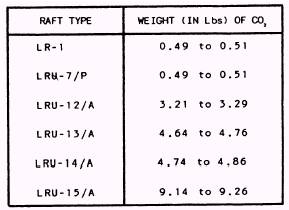 Table 8-2.-Carbon Dioxide Charge adapter. If the line does not hang free, accurate weight reading cannot be obtained. At this time, you must zero your scales. By zeroing the scales, you will be able to recharge the exact amount of CO2 into the inflation assembly. See table 8-2 for carbon dioxide charges. 7. Ensure that the inflation assembly valve is open. If it is closed, you cannot recharge the assembly. 8. Open the fill line valve slowly until you hear C O2 flowing through the line and into the inflation assembly, and the scale's indicator shows the recharging cylinder is gaining weight. 9. Allow carbon dioxide to cascade (flow freely) from the supply cylinder until the scales indicate that the cylinder being recharged isn't receiving anymore CO2. If you haven't reached the gross weight required (tare weight plus weight of charge) start the compressor and complete charging. Stop the compressor upon reaching the proper gross weight. At this time, you have completed the recharging process, and you must secure the equipment. 10. To shut the equipment down, start by securing the inflation assembly valve, and shut off the compressor. Then secure the fill line valve. Open the relief valve; this will relieve any pressure you may have in the line between the fill line valve and the inflation assembly. Disconnect the fill line from the inflation assembly and remove the charging adapter. To secure the rest of the system, all you have to do is close the supply cylinder valve and bleed the system by opening the fill line valve. If, during the recharging process, the cylinder being charged ceases to gain in weight, there may be one of two things wrong: 1. The supply cylinder may contain less than 10 pounds of carbon dioxide. In this case, a fully charged supply cylinder should be used and the partially charged cylinder reserved to start the recharging of an empty cylinder. 2. The connecting lines may have become stopped up with carbon dioxide snow. This may be caused by water in the supply cylinder or too small a valve passage (less than 1/8 in) in the supply cylinders. In this case, the disc assembly (disc-type valve) or the cylinder valve (seat-type valve) should be securely seated and the pump shut off. The connections should be broken and cleared of the carbon dioxide snow. The line will actually clear itself if allowed to stand for some length of time, but this can be hastened by applying a flame or torch to the tubing. The line should then be blown out with air to clear it of water or foreign matter. |