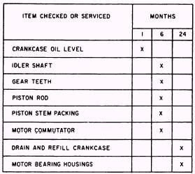 MAINTENANCE FOR THE C-O-TWO TRANSFER UNIT Once every month, inspect the level of the oil in the crankcase and see that it is within the limits specified. Once every 6 months, lubricate the idler shaft with two or three applications of light cup grease; also, lubricate the gear teeth with a thin coating of the same grease. With a small brush, apply a light coating of Vaseline to the piston rod. To do this, dip the brush in Vaseline and hold the brush against the piston rod while rotating the gears manually until the piston rod has been coated completely. If necessary, tighten the packing at the piston stem. A special wrench is needed for this operation. Do not tighten excessively. Because of the design of the packing, it is necessary to make only a snug adjustment to have it hold tightly. Keep the commutator or the motor clean. Under normal operating conditions, the commutator will require only occasional cleaning with a dry piece of nonlinting cloth. Never lubricate the commutator. Drain and refill the crankcase at least once a year. The bearing housings of the motor, which also need attention at this time, should be cleaned and regressed by a qualified electrician. Use table 8-3 for servicing intervals. MAINTENANCE OF THE WALTER KIDDE TRANSFER UNIT The instruction book on lubrication for the Walter Kidde transfer unit recommends inspecting the oil level in the crankcase periodically and changing it as necessary. Here, experience with pumps dictates the time of action. One can establish and maintain a schedule compatible with the experience gained through operating the equipment. The plunger packing needs no oil.