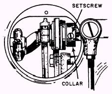 Figure 9-6.-Timing needle with shuttle. be in proper time for the machine to function properly. See figure 9-6. Timing the Needle with the Shuttle If a class 31 sewing machine does not form the lockstitch, if it skips stitches, or if it frays or breaks thread, the needle is not moving in the proper relationship with the shuttles motion. First make sure you have the right needle. Check the needle for the correct class, variety 16 x 87, and size. Insert the needle in the needle bar (long groove to the left) as far as it will go (fig. 9-6). Next compare the needle stroke to the shuttle stroke. To do this, remove the throat plate. Turn the balance wheel toward you until the point of the shuttle on its forward stroke reaches the center of the needle while the needle is on the upstroke. At this time, the needle bar should have risen 1/10 inch and the point of the shuttle should be 1/16 inch above the eye of the needle, as shown in A of figure 9-6. NOTE: Prior to making adjustments to the sewing machine, always follow the troubleshooting chart in Table 9-1. If the needle eye is not in this position, the following steps should be taken: 1. Loosen the needle bar connecting stud screw, as shown in B of figure 9-6. 2. Move the needle bar up or down as required; and then tighten the screw. 3. Rotate the balance wheel through the full cycle to check the timing. 4. Replace the throat plate. Timing the Feed Dog with the Needle The feed driving eccentric is an adjustable connection between the arm shaft (the shaft in the head) and the feed rock shaft (first shaft beneath the bed of the machine). If the feed mechanism is properly timed, the feed dog should be on its downstroke and level with the throat plate when the point of the needle reaches the material. If there is a twisted knot every 1 to 2 inches on the bottom of your material, check the timing of the needle before adjusting the feed mechanism. To adjust the feed eccentric, first lower the stitch regulator to the lowest position so the machine forms its longest stitch. Turn the balance wheel until the feed dog is on its downstroke and is flush with the throat plate. Move to the rear of the machine and take off the arm side cover. Turn the balance wheel away from you until the feed eccentric collar setscrew is visible (fig. 9-7). Hold the collar with your left thumb. Loosen the screw and rotate the balance wheel away from you until the needle, on its downstroke, reaches the material. Tighten the setscrew. Rotate the balance wheel to check the timing. Recheck the timing of the shuttle point with the needle. When you time the feeding mechanism, you may throw the needle out of time with the shuttle.