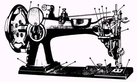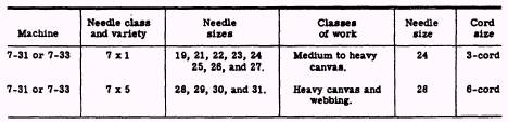 Regulating the Length of a Stitch The length of a stitch can be checked at the time the tension of the stitch is checked, as a trial run of stitches is necessary during both procedures. The length of a stitch is regulated by the thumbscrew in the slot on the front of the uprise of the machine. To LENGTHEN the stitch, loosen the thumbscrew and move the lever DOWN. To SHORTEN the stitch, loosen the thumbscrew and move the lever UP. When the desired length of stitch has been obtained by test running the machine on scrap material, tighten the thumbscrew. Regulating the Pressure on the Material Pressure on the material is regulated by the pressure-regulating thumbscrew on top of the machine face. To increase the pressure, turn the thumbscrew clockwise. The pressure should be just heavy enough to enable the feed dog to move the work along evenly. Removing Work Hand-turn the balance wheel toward you until the thread take-up lever is at its highest position. Raise the presser foot, either by the hand lever or by the knee lift, and draw the work and threads straight behind the presser foot. Cut the threads close to the material, leaving free about 2 inches of bobbin and machine thread. Adjusting the Thread Take-up Spring The thread take-up spring (fig. 9-15) should be set so that when the eye of the needle reaches the material on the downward stroke of the needle bar, the spring will be through acting on the thread, and will rest against the stop of the thread take-up spring regulator. If the thread take-up spring is not correctly set, loosen the setscrew (2) in the arm of the machine and turn the tension adjusting stud to the right for more movement of the spring, or to the left for less movement. When the spring is correctly set, retighten the setscrew. The tension on the thread take-up spring should be just sufficient to take up the slack of the needle thread until the eye of the needle reaches the material on its descent. To increase the tension on the thread take-up spring, loosen the tension adjusting stud and move the take-up spring from the recess in the regulator to the right between the regulator and the tension disks. When the required tension is obtained, securely tighten the tension adjusting stud and move the spring back into its position in the regulator recess. To decrease the tension, move the spring to the left between the regulator and the tension disks. SINGER SEWING MACHINE 7-33 The class 7-33 sewing machine is a lockstitch heavy duty machine, and is intended for use in sewing heavy canvas, webbings, and other material not adaptable to the lighter duty sewing machines. The only difference between the 7-31 and the 7-33 is that the 7-33 has the clutch on the motor, while the 7-31 has the clutch on the balance wheel. The operation and maintenance techniques are identical. The procedure for operating the 7-33 sewing machine is the same as for the 31-15 sewing machine. As on any Singer sewing machine, the balance wheel of the 7-33 should always turn toward the operator. Lubrication The 7-33 machine is oiled at all the oiling points shown in figures 9-17 and 9-18. The machine should be oiled twice daily when it is in constant use. Use a castor base oil as recommended by the manufacturer. Needles and Thread The procedure for ordering needles is the same for the 7-33 machine as for the 31-15 sewing machine. Refer to table 9-2 for the relative sizes of needles and thread.