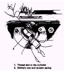 Turn the balance wheel forward to bring the needle bar and thread take-up lever to its lowest position. With the aid of the shuttle opening tool or a small screwdriver, insert the blade end in the slot in the spring latch beneath the shuttle cylinder (fig. 9-20). Press the latch away from the cylinder and it will swing out. The bobbin will then slide out of the shuttle cylinder. Winding the Bobbin Place the bobbin on the bobbin winder spindle and push it up closely against the shoulder. The small pin in the shoulder must enter the slot in the bobbin. Pass the thread from the thread stand through the hole in the left side of the bobbin from the inside. Push the bobbin winder pulley up against the balance wheel, and place the bobbin winder