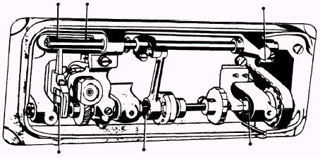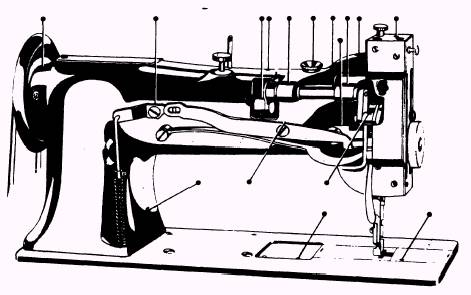 Timing the 111 W Class Sewing Machines The first step in timing the 111 W machine is to set the feed driving eccentric on zero stitches per inch (0 spi). Set the needle bar. With the needle bar in its lowest position (needle bar crank in the horizontal position, the rounded portion on the top and driving stud at the bottom), the connecting link will be vertical. Set the needle bar with the upper timing mark just visible at the base of the needle bar rock frame, and tighten the needle bar pinch screw. The needle bar is then properly set. To set a needle bar that has no mark, set the feed eccentric for eight stitches to the inch. Then set the needle bar so that when it rises 3/32 inch from its lowest position and the point of the sewing hook is at the center of the needle, the needle eye will be about 1/16 inch below the hook point. The next step is to time the arm shaft with the hook drive shaft. With the connection belt removed, rotate the balance wheel toward the operator until the thread take-up lever is at its highest point, then aline the arrow on the hook drive shaft collar with the timing plate arrow, and replace the connection belt. Rotate the balance wheel and check. The next step is to center the feeding action. For this step the feed driving eccentric must be set on zero spi. With the needle entering the feed dog, center the needle in the hole in the feed dog with a distance of 17/32 inch between the needle bar and the presser bar. In centering the feeding action, the following sequence should be followed: Hold the needle centered in the feed dog with a 17/32-inchspace between the needle bar and presser bar. Tighten the feed driving crank and feed driving rockshaft crank pinch screws, making sure that the crank is flush with the end of the feed driving rockshaft and parallel with the bed. Next, tighten the needle bar rock frame rockshaft crank pinch screw in the back of the uprise. The shank of the presser foot is 17/32 inch wide and may be used for measuring the space. The next step is to set the sewing hook to or from the needle. This is done by moving the hook saddle left or right as necessary; the hook should pass the needle as closely as possible without touching. When this is done, retighten the hook saddle screws. Next, set the sewing hook with the needle. With the needle bar on the upstroke, the lower timing mark on the needle bar should be just visible at the base of the needle bar rock frame. Set the point of the sewing hook in the center of the needle 1/16 inch above the eye. To advance the sewing hook, move the hook drive gear to the right; and to retard, move the hook drive gear to the left. NOTE: The first screw in the hook pinion gear and the second screw in the hook drive gear are splined screws. The hook drive gear must be centered in relation to the sewing hook shaft at the bottom of the hook saddle. " Lubrication of The Class 111 Sewing Machines