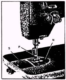 as possible when a straight stitch is desired. NOTE: The zigzag regulating knob can be moved into any desired position while the machine is operating. Do not turn the zigzag regulating knob when the machine is at rest and the needle is in the material. If you do you may bend or break the needle. Turn the handwheel toward you to raise the needle out of the material before operating the regulating knob. Preparing the Machine for Rope Stitching (Model 99R-3 only) For rope stitching, the standard combination of presser foot, feed dog, and (throat) needle plate is replaced with a special set of components designed specifically for this purpose. To do this, move slide plate (S of fig. 9-47) as far to the left