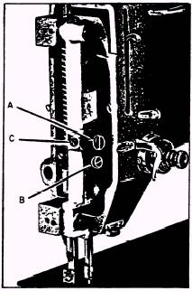 Figure 9-48.-Setting needle bar. the machine for straight sewing and turn the handwheel toward you until the needle bar reaches the lowest point of its downward stroke. Loosen setscrew (C of fig. 9-48) and turn eccentric stud (A of fig. 9-48) until the needle is centered correctly. Retighten setscrew (C). Set the zigzag knob to the widest stitch position and turn the handwheel toward you. Observe the passage of the needle through the needle (throat) plate. It should pass at about an equal distance from either end of the needle slot when making the left and right zigzag stitch. If necessary, readjust the eccentric stud (A of fig. 9-48) as described before.