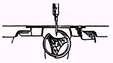 Remove the presser foot, slide plate, throat (needle) plate and bobbin case. Also remove the feed dog. With anew needle in the machine, turn the handwheel toward you until the needle bar reaches its lowest point. Continue turning and allow the needle bar to rise about 3/32 inch while on its upward stroke. With needle bar in this