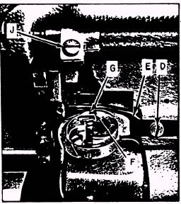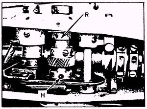 Figure 9-51.-Removing sewing hook. the bottom, then remove the sewing hook from its shaft (fig. 9-5 1). When installing a new sewing hook, have the thread guard at the bottom. Now turn the bobbin case holder until the notch (F) is at the top. Replace the hook retainer (E) watching that the projection (G) near its end (fig. 9-50) enters notch (F) in the bobbin case holder. Fasten the hook retainer to the underside of the bed by means of its screw. Replace the needle and time the sewing hook as described in the preceding paragraph. Reinstall the bobbin case, throat plate, and slide plate. Timing the Feeding Mechanism The feeding mechanism is timed at the factory for average stitching performance. Normal timing is such that the feed dog teeth, rising from their lowest position, should be just flush with the surface of the throat (needle) plate after the needle point has traveled about 5/16 inch above the plate while on its upstroke. To adjust the feeding mechanism, remove the top cover from the machine. Turn the handwheel toward you until the two setscrews, which lock the feed eccentric into the main shaft, come into view (fig. 9-5 1). Loosen both setscrews; lightly tap the feed eccentric toward you to advance the feed timing. To retard the feed timing, tap the eccentric to rotate it toward the rear of the machine. NOTE: Rotate the eccentric no more than about 1/16 inch, then tighten its setscrews and check for results. Timing the Movement of the Needle Bar Frame Set the zigzag knob for straight stitch. Turn the handwheel and observe the travel of the needle into and out of the needle slot in the throat (needle) plate. If the needle is not centered in the slot, make the adjustments that have been described. Now adjust the needle to produce the widest zigzag stitch. Turn the handwheel toward you and observe vibration (sidewise movement) of the needle bar. The needle bar, on its upward movement, should begin to vibrate when the point of the needle is no less than about 3/32 inch above the throat plate, and should stop vibrating when the needle has reached approximately the same position on its downward movement. To adjust the vibration of the needle bar on model 99R, loosen the setscrews (H of figure 9-51) in the vibrator cam and slightly turn this cam on its shaft. Tighten the setscrews and check for results. On model 99R-3, the vibration of the needle bar is produced by a plate cam located at R on figure 9-51. Loosen its setscrews and slightly turn the cam on its shaft, following the same procedure as outlined in the preceding paragraph. Be sure to retighten the setscrews.
