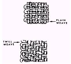 Figure 10-2.-Basic weaves. are many, many different types of fabrics, or cloth. When we say cloth, we mean any textile material over 12 inches wide from selvage to selvage. The construction of cloth is determined by many factors, such as tightness of yarn twist, number of threads per inch, porosity of the yarns, and the type of weave used in its formation. The weave is one of the most important factors. The two basic weaves are plain and twill (as shown in figure 10-2). The plain weave is the simplest method of weaving and gives the smoothest surface of the fabric. It consists of the filling threads passing over one warp thread and under the next warp thread. The twill weave is a more complicated weave in which the filling threads pass over and under more than one warp thread, thereby producing a surface on the fabric that is generally recognized as a diagonal pattern. Cotton Cotton is a natural plant fiber, usually white. The fibers or "staples" are between 3/8 and 2 inches in length. Chemically, it is almost pure cellulose. Cotton fabrics, webbing, and tapes absorb water readily unless treated. They dry more slowly than the synthetic fabrics and are more susceptible to mildew and fungus growth. One should never ignore the presence of mildew because it seriously affects the tensile strength of cotton and other fabrics. Heat is less damaging to cotton than to the synthetics. Insect damage should, however, always be considered because cotton is a food for certain cellulose-eating insects, and cotton makes good nesting or cocoonspinning material for rodents and insects. Nylon This is a synthetic fiber of extreme toughness and elasticity. It absorbs very little water, dries quickly, is mildewproof, and is not affected by most ordinary oils, greases, or cleaning fluids. It is also mothproof. It is sensitive to some chemical fumes, excessive heat, and direct rays of sunlight. Nylon melts and drips when it is subjected to fire. This characteristic requires that precautions be taken when nylon is worn where there is a risk of fire. Melted nylon on the skin can cause the most serious of burns. NOMEX is the trade name for a fabric that is used in the construction of flight suits. NOMEX fabric is a high-temperature resistant and inherently flame-retardant synthetic fabric. This fabric has no melt point or drip characteristics when it is subjected to fire. NOMEX material is light in weight, does not support combustion, but begins to char at 700 to 800 F. The fabric, similar to nylon, is abrasion resistant, and is also nonabsorbent. Duck This is a comparatively firm, coarse, plainweave, cotton fabric with weight per square yard from 6 to 50 ounces. Duck is frequently called canvas. It is primarily used in the construction of protective covers because of its durability and wearing characteristics. Rubber and rubberized fabrics are used in the manufacture of exposure suits and flotation equipment because they are watertight. Rubberized materials are susceptible to deterioration if subjected to heat and mildew. Foam rubber is thick and resilient and is used for padding in upholstery and aircraft crash pads. Leather Cowhide or horsehide may be used for reinforcing patches where heavy wear occurs. It is used for reinforcing patches for grommets and chafing strips on seat belts. Artificial leather has replaced the natural product, and is used to a large extent for seat pad, crash pad, and upholstery covering. Vinyl Vinyl is a plastic material and is used in many instances in the fabric shop. Vinyl is available in various thicknesses, depending on its intended use. It may be used for seat covers or ventilating clothing. The type used for ventilating clothing consists of two layers of flexible vinyl film. Vinyl is vaportight and has a smooth surface. Soap and water can be used to clean it. Do not use ammonia detergents for cleaning because this bleaches the vinyl. WEBBINGS AND TAPES You already know that cloth is fabric wider than 12 inches. Any fabric less than 12 inches, from selvage to selvage edge, is called webbing or tape. The dividing line between webbing and tape is determined by the respective weight. Webbings The heavier of the two is webbing. Webbing weighs over 15 ounces per square yard and is less than 12 inches wide. As you would expect, webbings are used for the toughest holding and reinforcing jobs. Slings, harnesses, safety belts, reinforcing and securing straps are made of nylon, with a wide variety of tensile strength. The personnel parachute harness has a tensile strength range of 6,000 to 8,700 pounds. Some nylon webbings are of tubular construction, which makes them very strong. Tubular webbings are 1/2 to 1 inch wide, with tensile strengths ranging from 1,000 to 4,000 pounds. Tapes In addition to webbings, there are the lightweight tapes of a twill weave construction. You can use tapes for reinforcement on many types of fabric covers. Tapes can weigh up to 15 ounces per square yard. Cloth tapes are woven in the same manner as fabric. Some are bias, which, because of the bias cut or construction, aid the binding of curved edges where stretching qualities are desired. These bias tapes are sometimes referred to as binding tapes. Velcro tape is commonly used in many shops as a fastening or closing device. Velcro tape consists of two parts-the hook and the pile or loop tape. The hook tape is made of nylon, which consists of a series of small hooks. The nylon pile or loop tape has many small loops. When the two parts of the tape are joined, the hooks engage with the loops holding the two tapes together. |