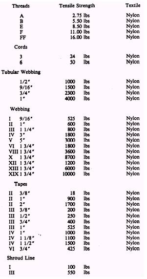 ENGINEERING REQUIREMENTS FOR FABRICS If a parachute is to serve its purpose, it must be reliable. To be reliable, parachutes must meet certain engineering requirements. At this point you may be wondering why you should be concerned with engineering requirements. After all, you are not designing parachutes. You service parachutes. Here is where the difference shows up between just a parachute packer and a good parachute rigger. Almost anyone can learn to pack a parachute. But a good parachute rigger needs to understand the' 'why" that determines maintenance procedures. When you have learned the engineering and aerodynamic principles that affect parachute reliability, you will know why it is so important to be a conscientious and precise worker. And, you will see to it that those who work for you do their job exactly right. First, the engineering requirements for parachutes are listed and explained below. Then you will learn why the textile most often used in parachute construction is nylon. Air Permeability The term air permeability refers to the measured volume of air in cubic feet that flows through 1 square foot of cloth in 1 minute at a given pressure. If a material gets wet and shrinks, it has less air permeability y, because the weave draws together and less air gets through. This is the reason for that very important rule: DO NOT, FOR ANY REASON, PACK A WET PARACHUTE. Also, a wet parachute assembly can freeze at high altitudes. Air permeability y affects the reliability, opening time, opening force, canopy drag, and stability of the parachute assembly. The proper ratio of air entering a parachute canopy to air passing over the canopy gives a parachute good performance. The greater the airflow through a canopy, the slower the opening time. This is why canopy designs differ. A quick opening time is required for personnel parachutes, but a slower opening time is desired for deceleration and cargo parachutes. The braking force in deceleration and cargo parachutes is built up over a longer period of time, which enables the parachute assembly to withstand and decelerate greater loads. Strength The term strength refers to a fabric's ability to resist strain or rupture by external forces. Strength is expressed as tensile strength (a term you already know) and is measured in pounds per square inch. The strength of the fabric determines the strength of the parachute. Remember the old saying about the chain being only as strong as its weakest link. Strength is a very important requirement for a safe, reliable parachute. Refer to table 10-1 for tensile strengths of fabrics, webbings and tapes.