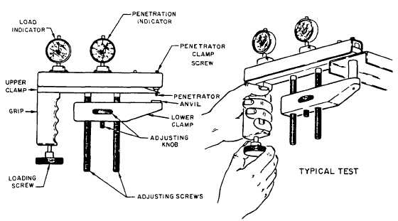 Figure 1-28.-Riehle portable hardness tester. numbers in the outer circle are black, and the inner numbers are red.The Rockwell tester is equipped with a weight pan, and two weights are supplied with the machine. One weight is marked in red. The other weight is marked in black. With no weight in the weight pan, the machine applies a major load of 60 kilograms. If the scale setup calls for a 100-kilogram load, the red weight is placed in the pan. For a 150-kilogram load, the black weight is added to the red weight. The black weight is always used in conjunction with the red weight; it is never used alone. Practically all testing is done with either the B-scale setup or the C-scale setup. For these scales, the colors may be used as a guide in selecting the weight (or weights) and in reading the dial. For the B-scale test, use the red weight and read the red numbers. For a C-scale test, add the black weight to the red weight and read the black numbers.In setting up the Rockwell machine, use the diamond penetrator for testing materials that are known to be hard. If in doubt, try the diamond, since the steel ball may be deformed if used for testing hard materials. If the metal tests below C-22, then change to the steel ball.Use the steel ball for all soft materials-those testing less than B-100. Should an overlap occur at the top of the B scale and the bottom of the C scale, use the C-scale setup.Before the major load is applied, the test specimen must be securely locked in place to prevent slipping and to properly seat the anvil and penetrator. To do this, a load of 10 kilograms is applied before the lever is tripped. This preliminary load is called the "minor load." The minor load is 10 kilograms regardless of the scale setup. When the machine is set up properly, it auto-matically applies the 10-kilogram load.The metal to be tested in the Rockwell tester must be ground smooth on two opposite sides and be free of scratches and foreign matter. The surface should be perpendicular to the axis of penetration, and the two opposite ground surfaces should be parallel. If the specimen is tapered, the amount of error will depend on the taper. A curved surface will also cause a slight error in the hardness test. The amount of error depends on the curvaturethe smaller the radius of curvature, the greater the error. To eliminate such error, a small flat should be ground on the curved surface if possible. |