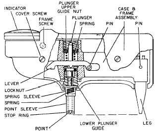 Figure 1-30-Cutaway of Barcol tester. Figure 1-30 is a cutaway drawing of the tester, showing the internal parts and their general arrangement within the case.The lower plunger guide and point are accurately ground so that attention need be given only to the proper position of the lower plunger guide within the frame to obtain accurate operation when a point is replaced. The frame, into which the lower plunger guide and spring-tensioned plunger are screwed, holds the point in the proper position. Adjustment of the plunger upper guide nut, which regulates the spring tension, is made when the instrument is calibrated at the factory.CAUTION The position of this nut should not be changed. Any adjustment made to the plunger upper guide nut will void the calibrated settings made at the factory.The leg is set for testing surfaces that permit the lower plunger guide and the leg plate to be on the same plane. For testing rivets or other raised objects, a block may be placed under the leg plate to raise it to the same plane. For permanent testing of this type, the leg maybe removed and washers inserted, as shown in the drawing. The point should always be perpendicular to the surface being tested.The design of the Barcol tester is such that operating experience is not necessary. It is only necessary to exert a light pressure against the instrument to drive the spring-loaded indenter into the material to be tested. TheTable 1-5.-Typical Barcol Readings for Aluminum Alloys