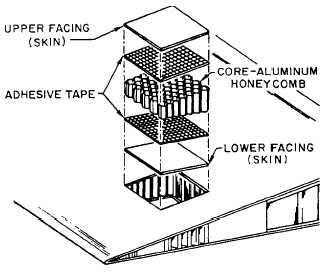 Figure 1-32.-Sandwich construction. requirements of specific applications. However, these materials are highly susceptible to impact damage, and the extent of the damage is difficult to determine visually. Nondestructive inspection (NDI) is required to analyze the extent of damage and the effectiveness of repairs. In addition, repair differs from traditional metallic repair techniques. A more detailed explanation of advanced composites and their inspection and repair procedures are covered in chapter 14 of this TRAMAN. |