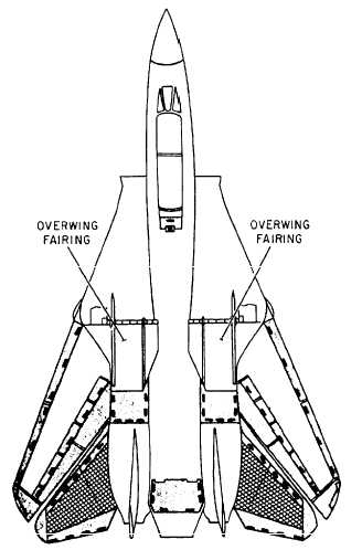 Figure 1-8.-Wing oversweep position-manual control (F-14). WING SURFACE CONTROL SYSTEM. -The wing surface control system controls the variable-geometry wings to maximize aircraft performance at all speeds and altitudes. The system also provides high lift and drag forces for takeoff and landing, and increased lift for slow speeds. At supersonic speeds, the system produces aerodynamic lift to reduce trim drag. The wing sweep control, initiated at the throttle quadrant, provides electronic or mechanical control of a hydromechanical system that sweeps the wings. See figure 1-7. The wings can be swept from 20 degrees through 68 degrees in flight. On the ground, mechanical control allows awing sweep position of 75 degrees. See figure 1-8. This position is used when flight deck personnel spot the aircraft or when maintenance personnel need to enable the wing sweep control self-test.Electronic Control. -Wing sweep using electronic control is initiated at the throttle quadrant. Four modes are available: automatic, aft manual, forward manual, or bomb manual. Selection of these modes causes the air data computer to generate wing sweep commands consistent with the aircrafts speed, altitude, and configuration of the flaps and slats. If the automatic mode is used to apply the commands, the wings are positioned at a rate of 7.5 degrees per second.Mechanical Control. -When wing sweep is in the mechanical control mode, the wing sweep handle uses the wing sweep/flap and slat control box to position the wings. Because minimum wing sweep limiting is not available in the mechanical control mode, the wings can be swept to an adverse position that could cause damage to the wings. Mechanical control is used for emergency wing sweep and wing oversweep. |
