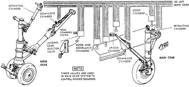 Figure 1-10.-Typical landing gear system. consequently reduced, and considerable drag is added to the wing.Another type of spoiler in common use is a long, slender, curved and perforated baffle that is raised edgewise through the upper surface of the wing forward of the aileron. It also disrupts the flow of air over the airfoil and destroys lift. These spoilers are actuated through the same linkage that actuates the ailerons. This arrangement makes movement of the spoiler dependent upon movement of the aileron. The linkage to the aileron is devised so that the spoiler is extended only when the aileron is raised. In other words, when the aileron moves downward, no deflection of the spoiler takes place.SPEED BRAKES. -Speed brakes are hinged, movable control surfaces used for reducing the speed of aircraft. Some manufacturers refer to them as dive flaps. They are hinged to the sides or bottom of the fuselage or to the wings. Regardless of their location, speed brakes serve the same purpose on all aircraft. Their primary purpose is to keep aircraft from building up excessive speed during dives. They are also used in slowing down the speed of the aircraft prior to landing. Speed brakes are operated hydraulically or electrically.SLATS. -Slats are movable control surfaces attached to the leading edge of the wing. When the slat is retracted, it forms the leading edge of the wing. At low airspeed, the slat improves the lateral control-handling characteristics and allows the aircraft to be controlled at airspeeds below the normal landing speed. When the slat is opened (extended forward), a slot is created between the slat and the leading edge of the wing. The slot allows high-energy air to be introduced into the air layer moving over the top of the wing. This is known as and arrested landings. Boundary layer control can also be accomplished by a method of directing high-pressure engine bleed air through a series of narrow orifices located just forward of the wing flap leading edge.AILERON DROOP. -The ailerons are also sometimes used to supplement the flaps. This is called an aileron droop feature. When the flaps are lowered, both ailerons can be partially deflected downward into the airstream. The partial deflection aIlows them to act as flaps as well as to serve the function of ailerons. |