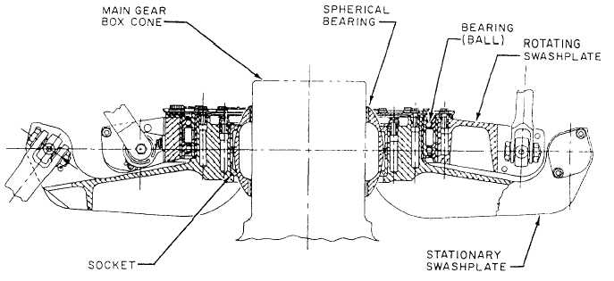 stationary swashplate. When the primary servo cylinders are actuated by the flight controls, the stationary swashplate moves, with this movement being transmitted to the rotating swashplate. The rotating swashplate sends movement, through the adjustable pitch control rods, to the sleeve spindle of the rotary blades. This action changes the angle of incidence of the blades |