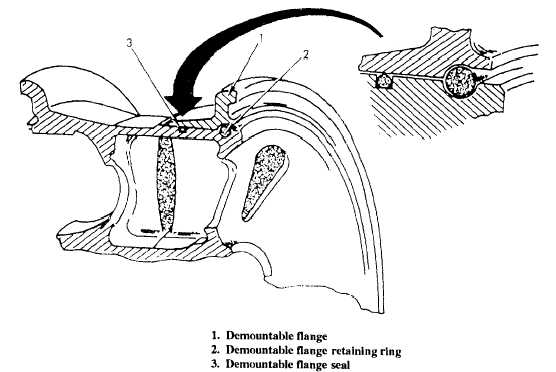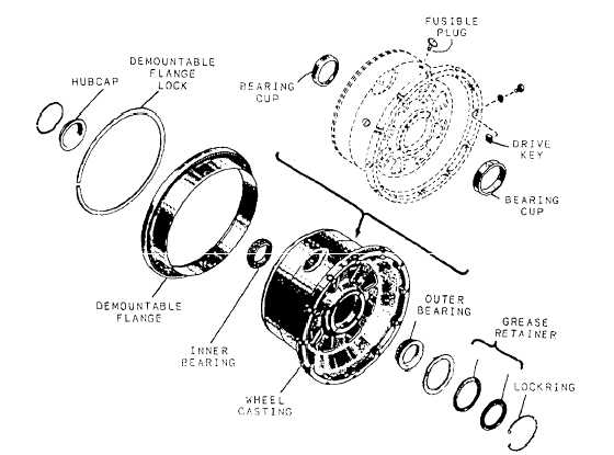 The demountable flange is attached to the wheel to simplify tire removal and installation. The remountable flange lockring secures the flange to the wheel. The flange is fitted into a groove in the wheel casting.The bearing cups are shrink-fitted into the hub of the wheel casting, and are the parts on which the bearings ride. The bearings are tapered roller bearings. Each bearing is made of a cone and rollers. This type of bearing absorbs side thrust as well as radial loads and landing shocks. These bearings must be cleaned and lubricated in accordance with the NAVAIR 04-10-1 manual.A three-piece grease retainer keeps the grease in the inboard bearing and keeps out dirt and moisture. It is composed of a felt seal and inner and outer closure rings. A lockring secures the assembly inside the wheel hub.The hubcap seals the outboard side of the hub. It is secured with a lockring. On some aircraft, the hubcap is secured with screws.All wheels designed to be used on the main landing gear are equipped with braking components. These components are attached to the wheel casting. They may consist of either a brake drum or brake drive keys. The wheel shown in figure 11-3 is