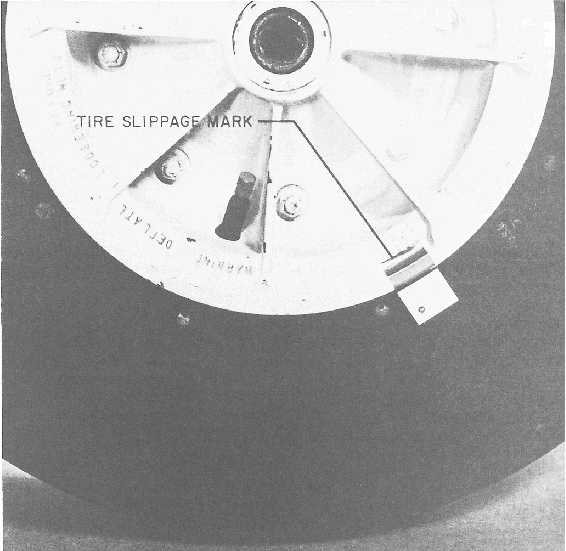putting a small amount of suitable leak detection solution (Leaktec) or soapy water on the end of the valve and watch for bubbles. Replace the valve core if it is leaking. If no bubbles appear, it is an indication that the inner tube (or tire) has a leak. When the tire and wheel assembly shows repeated pressure loss exceeding 5 percent of the correct operating inflation pressure, it should be removed from the aircraft and sent to the AIMD or IMA.WARNING Overinflation or underinflation can cause catastrophic failure of aircraft tire and wheel assemblies. This could result in injury, death, and/or damage to aircraft or other equipment.After making a pressure check, you should always replace the valve cap. Be sure that it is screwed on fingertight. The cap prevents moisture, salt, oil, and dirt from entering the valve stem and damaging the valve core. It also acts as a secondary seal if a leak develops in the valve core.Tires that are equipped with inner tubes, and operate with less than 150 psi, and all helicopter tube tires must use tire slippage marks. The slippage mark is a red paint strip 1 inch wide and 2 inches long. It extends equally across the tire sidewall and the wheel rim, as shown in figure 11-16. Tires should be inspected for slippage on the rim after each flight. If the markings do not align within one-fourth of an inch, the wheel assembly should be replaced and the defective assembly forwarded to the AIMD or IMA for repair. Failure to correct tire slippage may cause the valve stem to be ripped from the tube.Tire treads should be inspected to determine the extent of wear. The maximum allowable thread wear for tires without wear depth indicators is when the tread pattern is worn to the bottom of the tread groove at any spot on the tire. The maximum allowable tread wear for tires with tread wear indicators is when the tread pattern is worn either to the bottom of the wear depth indicator or the bottom of the tread groove. These limits apply regardless of whether the wear is the result of skidding or normal use.The tread and sidewall should be examined for cuts and embedded foreign objects. Figure 11-17 shows the method for measuring the depth of cuts, cracks, and holes. Glass, stones, metal, and other materials embedded in the tread should be removed to prevent cut growth and eventual carcass damage. A blunt awl or screwdriver maybe used for this purpose. You should be careful to avoid enlarging the hole or damaging the cord body fabric.WARNING When you are probing for foreign objects, be sure you keep the probe from penetrating deeper into the tire. Objects being pried from the tire frequently are ejected suddenly and with considerable force. To avoid eye injury, safety glasses or a face shield should be worn. A gloved hand over the object may be used to deflect it.Aircraft should not be parked in areas where the tires may stand in spilled hydraulic fluids, lubricating oils, fuel, or organic solvents. If any of these materials is accidentally spilled on a tire, it should be immediately wiped with a clean, absorbent cloth. The tires should then be washed with soap and thoroughly rinsed with water.Extra care should be taken when you inspect mounted helicopter tires. Because of the long intervals between tire changes, helicopter tires are subject to weather and UV damage. |