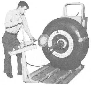 Dismounting In the tire shop, you should recheck tires for complete deflation before disassembling the wheel and breaking the bead of the tire. Breaking the bead means separating the bead of the tire from the wheel flange. When a tire has been completely deflated and set aside to await the bead-breaking operation, the valve core should be removed and a deflated tire tag installed on the valve stem. The tire tags should be so constructed as not to be installable unless the valve core has been removed. Refer to figure 11-5.BREAKING THE BEAD. The use of proper equipment for breaking the bead of the tire away from the wheel flange will save materials and man-hours. Aircraft tires, inner tubes, and wheels can be damaged beyond repair by improper mounting and dismounting equipment and procedures. Always refer to the applicable manufacturers operating manual prior to using this equipment. The equipment shown in figure 11-18 is recommended in NAVAIR 04-10-506. Other commercially available or locally fabricated equipment that uses either a hydraulically actuated cylinder or a mechanically actuated device may also be used, provided the equipment will not damage the tires or wheels. The bead-breaking equipment shown in figure 11-18 is available in two models. The Lee-I model is designed for use at shore-based facilities. The Lee-IX model is an explosionproof version of the Lee-I, and is intended for shipboard use.An example of the steps used for bead breaking using the Lee-I equipment follows:1. Ensure the tire is completely deflated. 2. Determine the type and size of the wheel to be dismounted, and assemble the proper parts on the drive shaft.3. Push the outer centering rollers toward the front of the machine, and roll the wheel (positioned with the lockring side facing outward for remountable flange wheels) on the outer centering rollers. You should use the up and down push buttons to raise or lower the drive shaft to the proper height for the wheel being dismounted. Push the wheel onto the drive shaft. If an open-rimmed tire assembly is being dismounted, omit step 4 and proceed to step 5.4. Insert the locking bar and turn it about 90 degrees counterclockwise. Mount the wheel cone on the locking bar and insert the locking pin.5. Push the air valve switch to the right. This will clamp the wheel on the drive shaft.