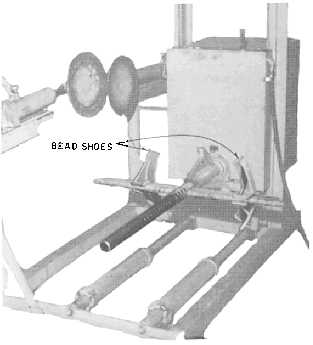 6. Use the UP push button to raise the center of the wheel to line up with the center of the bead-breaking disc.7. Rotate the tire by pushing the tire rotating toggle to the right. Position the front bead-breaking disc against the outside bead of the wheel flange. You should adjust the position of the hydraulic pump assembly by loosening the position lockpin and sliding the pump to the proper position. After turning the pump release valve clockwise as far as it will go, apply hydraulic pressure against the bead by pumping the handle, as shown in figure 11-19. Use the guide handle to properly position the disc. Push the bead back far enough to allow the removal of the lockring or loose flange.8. Remove the lockring and loose flange. You should use the bead shoes to hold the bead back while you are removing the lockring. See figure 11-20. Release and retract the front bead-breaking disc by turning the release valve counterclockwise.9. Repeat the bead-breaking operation against the rear surface of the tire with the rear bead-breaking assembly.