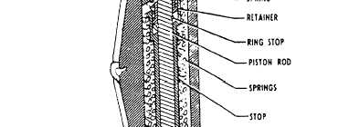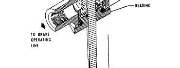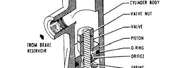 Goodyear Master Cylinder A cutaway view of the Goodyear master cylinder is shown in figure 12-23. Fluid is fed by gravity to the master cylinder from an external reservoir. The fluid enters through the cylinder inlet port and compensating port and fills the master cylinder casting ahead of the piston and the fluid line leading to the brake actuating cylinder.Application of the brake pedal, which is linked to the master cylinder piston rod causes the piston rod to push the piston forward inside the master cylinder casting. A slight forward movement blocks the compensating port, and the buildup of pressure begins. This pressure is transmitted to the broke assembly. When the brake pedal is released and returns to the OFF position, the piston return spring pushes the front piston seal and the piston back to full OFF position against the piston return stop. This action again clears the compensating port. Fluid that was moved into the brake assembly and brake connecting line is then pushed back to the master cylinder by the brake piston as the piston is returned to the OFF position by the pressure of the brake piston return springs.Any pressure or excess volume of fluid is relieved through the compensating port and passes back to the fluid reservoir. The compensating port assures against dragging or locked brakes.If any fluid is lost back of the front piston seal due to leakage, it is automatically replaced with fluid from the reservoir by gravity. Any fluid lost in front of the piston from leaks in the line or at the brake is automatically replaced through the piston head ports, and around the lip of the front piston seal when the piston makes the return stroke to the full OFF position. The front piston seal functions as a seal only during the forward stroke. These automatic fluid replacement arrangements always keep the master cylinder, brake connecting line, and brake assembly fully supplied with fluid as long as there is fluid in the reservoir.The rear piston seal seals the rear end of the cylinder at all times to prevent leakage of fluid. The flexible rubber boot serves only to keep out dust.Provision is made for locking the brakes for parking by a ratchet-type lock built into the mechanical linkage between the master cylinder and the brake pedal. Any change in the volume of fluid, due to expansion while the parking brake is on, is taken care of by a spring incorporated in the linkage. The brakes are unlocked by application of sufficient pressure on the brake pedals to unload the ratchet.Brake systems employing the Goodyear master cylinder must be bled from the top down. In no case should bleeding be attempted from the bottom up, because it is impossible to remove the air in back of the piston seal. Bleeding operations are covered later in this chapter.Gladden Master Cylinder The Gladden master brake cylinder consists of a cylinder body, valve, piston, piston rod, return springs, and a stop assembly, as shown in figure 12-24. The piston rod extends through the valve, the piston, the stop assembly, and the return springs, and is connected by an eyebolt to the broke arm on the rudder pedal. When the cylinder is in neutral, the valve is not seated. Fluid from an independent brake reservoir enters the cylinders reservoir port. Fluid entering this port is allowed to flow through the piston and fill the lower chamber.When the rudder pedal is depressed by toe pressure, the piston rod is pulled downward, causing the valve to seat and close the piston orifice, This movement also forces fluid into the brakes pressure line to the wheel brake assembly, thus applying the brakes.