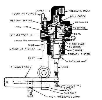 Figure 12-27.-Power brake control valve (pressure ball check type).is a check valve, which prevents loss of brake system pressure in case of main system failure.The next unit is the accumulator, the main purpose of which is to store a reserve supply of fluid under pressure. When the brakes are applied and pressure drops in the accumulator, more fluid enters from the main system and is trapped by the check valve. The accumulator also acts as a surge chamber for excessive loads imposed upon the brake hydraulic system.Following the accumulator are the pilots and copilots brake valves. The purpose of a brake valve is to regulate and control the volume and pressure of the fluid that actuates the brake.Four check valves and two one-way restrictors, sometimes referred to as orifice check valves, are installed in the pilots and copilots brake actuating lines. The check valves allow the flow of fluid in one direction only. The orifice check valves allow unrestricted flow of fluid in one direction, from the pilots brake valve; flow in the opposite direction is restricted by an orifice in the poppet. The purpose of the orifice check valves is to help prevent chatter.The next unit in the brake actuating lines is the pressure relief valve. In this particular system, the pressure relief valve is preset to open at 825 psi to discharge fluid into the return line. The valve closes at 760 psi minimum.Each brake actuating line incorporates a shuttle valve for the purpose of isolating the emergency brake