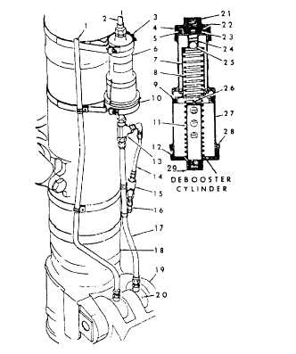 1. Emergency system pressure line2. Main brake pressure line 3. Upper support clamp 4. Packing 5. Packing 6. Debooster cylinder assembly 7. Piston 8. Piston return spring 9. Packing 10. Lower support clamp 11. Riser tube 12. Packing 13. Tee fitting 14. Brake line (to pressure relief valve) 15. Brake pressure-relief valve 16. Overflow line 17. Brake tine (debooster to shuttle valve) 18. Shock strut 19. Torque link 20. Brake shuttle valve 21. Inlet port 22. Snapring 23. Spring retainer 24. Valve spring 25. Ball 26. Ball pedestal 27. Barrel 28. Lower cud cap 29. Outlet port Figure 12-29.-Brake debooster cylinder. large piston head, pressure at the outlet poet is reduced. At the same time, a greater volume of fluid is displaced by the large piston head than that used to move the small piston head.Normally, the brake will be fully applied before the piston has reached the lower end of its travel. However, if the piston fails to meet sufficient resistance to stop it (due to a loss of fluid from the brake unit or connecting lines), the piston will continue to move downward until the riser unseats the ball check valve in the hollow shaft. With the ball check valve unseated, fluid from the power control valve will pass through the piston shaft to