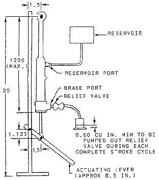 Figure 12-44.-Rod packing, cylinder leakage, and pumping function test. should be no external leakage for 1 minute from either port.To perform the piston, valve, and brake chamber proof test, install the unit in the jig (fig. 12-43), and harness it at the midstroke position with 25-psi hydraulic pressure applied at the brake port. There should be no external leakage. Leakage at the reservoir port should not exceed 1 drop per minute for 2 minutes after a 1-minute waiting period. If the unit tests satisfactorily at this stage, the pressure should be increased to 2,000 psi. There should be no external leakage, and leakage at the reservoir port should not exceed 1 drop per minute for 2 minutes after a 1-minute waiting period.When the foregoing test is completed, the unit is ready to receive a rod packing, cycling leakage, and pumping function test. With the unit extended and installed in the actuating fixture, a reservoir should be connected to the reservoir port and a 200- to 400- psi relief valve should be connected to the brake port. See figure 12-44. Operation of the manual lever through five full strokes should pump hydraulic fluid through the relief valve. Leakage at the piston rod gland should not exceed 1 drop at this time. Not less than 0.75 cubic inch of fluid should flow from the relief valve during anyone complete stroke cycle of the manual lever. There should be no evidence of binding at any time during these tests.BRAKE SHUTTLE VALVE Shuttle valve maintenance is generally limited to repairing leakage. External leakage may usually be repaired by tightening the end caps. If this does not stop the leakage, the end cap O-ring should be replaced. Internal leakage can usually be repaired by removing and flushing the unit with clean, hydraulic fluid. Excessive heating is a good indication of internal leakage through a shuttle valve. Excessive cycling of the emergency system pump is also an indication of a leaky shuttle valve.After an emergency system has been operated, all emergency system pressure should be bled off as soon as possible and the normal system restored to operation. |