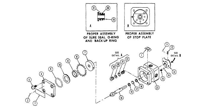 1. Decal Figure 1245.-Brake selector valve-exploded view. This procedure completes the thermal crack test. In preparation for the shuttle valve opening operation test that follows, block residual pressure in the BRAKE port using a pressure gauge as the plug.With the RET port open and BRAKE port capped, apply hand-pumped hydraulic pressure gradually to the PMV port. There should be a simultaneous increase of BRAKE port pressure with PMV port pressure. At a pressure of 60 to 80 psi in the PMV port, pressure in the PMV port and BRAKE port should become equal. A gradual increase in PMV port pressure to 1,500 psi should result in a proportionate increase in the BRAKE port pressure. Any displacement at the RET port should not be considered leakage during this phase of the bench test. The shuttle valve closing operation test begins with 1,500 psi from the previous phase still applied to the PMV port. Reduce the pressure at the PMV port to 150 psi, and then rapidly to 0 psi. The closing operation is evidenced by the venting of hydraulic fluid from the RET port as PMV pressure decreases from 20 psi to 0 psi. The final phase of the bench test is the test for leakage. This phase is started with 27-psi hydraulic pressure trapped in the BRAKE port. There should be no evidence of pressure decrease when it is measured over a period of 3 minutes. Continue the test with the BRAKE port capped and the RET port of the valve in an upright position. Fill the RET port cavity and a leakage measuring device with hydraulic fluid. Apply hand-pumped hydraulic pressure of 30 to 37 psi to the PMV port. Leakage at the RET port must not exceed 0.5 cubic centimeter per minute. Immediately after application of pressure, measure the leakage for a 3-minute period. Disregard volume displacement because of shuttle valve transition if leakage is not in excess of 0.5 cubic centimeter per minute. Increase the pressure to 125 psi and maintain for a 3-minute period. There should be no evidence of leakage. Further increase the pressure to 1,500 psi and maintain for another 3-minute period. There should be no leakage. |