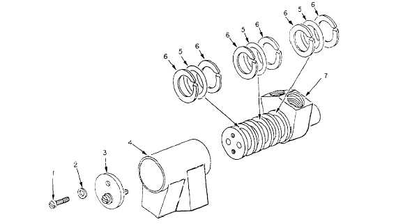 1. Screw Figure 1246.-Brake swivel. machine screws are lockwired to aid in reassembly. Disassemble the valve and clean all parts with P-D-680 cleaning solvent. Dry all parts thoroughly, using low-pressure, moisture-free, compressed air or a lint-free, clean cloth. Inspect all parts for scratches, cracks, scoring, burrs, nicks, excessive wear, and distortion. If any part other than those listed in the Spare and Repair Parts Data is faulty, the component must be tagged to show the fault and forwarded to the next higher level of maintenance.Replace all sealing devices and worn or damaged parts. Apply a light coating of hydrauIic fluid on all O-rings, backup rings, seals, and wear surfaces before reassembly. Note the proper assembly of the seal, O-ring and backup ring, and the proper assembly of the stop plate, as shown in figure 12-45. Reassembly is essentially the reverse order of disassembly. Steps that require quality assurance verification in the MIMs are identified by the letters "QA" after the applicable steps.When QA is assigned to a step or a heading that is immediately followed by substeps, the inspection is applicable to all substeps. The four machine screws that hold the selector valve assembly together must be tightened and properly lockwired.NOTE: In some MIMs, the steps in a procedure that require a QA inspection are underlined or italicized.Bench test the repaired valve to verify its ready-for- issue (RFI) condition. The hydraulic fluid used to test the valve must be continuously filtered by a 3-micron absolute, nonbypass filter upstream of the valve. Allow the test stand fluid to reach an operating temperature of 70 to 110F before the testing begins. The valve must pass a proof test, static pressure test, actuation (operational) test, and leakage tests. During the actuation test, the amount of torque required to operate the valve to any position should not exceed 40 inch-pounds with 3,000 psi applied to the pressure port. The requirements for each test are specified in the "Intermediate Repair" section of the MIM. |