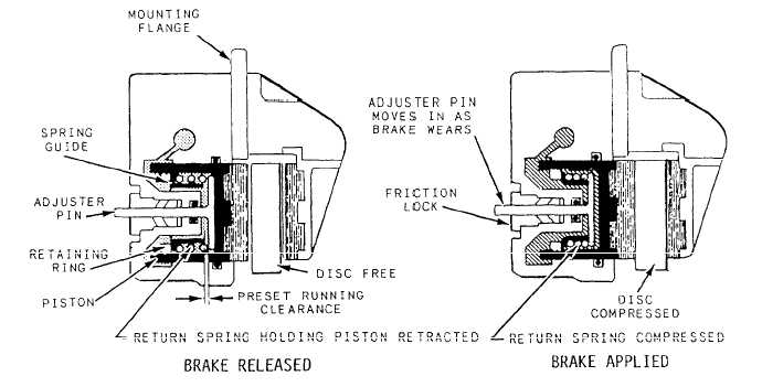 Figure 1247.-Brake self-adjustment feature-single disc brake. Proof testing is accomplished by applying 4,500 psi individualy to each port with the opposing port plugged. Maintain the pressure for 2 minutes, and there should be no leakage. Conduct this check a minimum of three times, and during the last proof test, rotate the swivel through a complete swiveling circle. Conduct the static leak test in the same manner as the proof test using 5 to 10 psi. Next, apply 3,000 psi to both the normal and emergency ports with the opposing ports plugged. Gradually, apply and check the torque required to rotate the swivel. Maximum torque required should not exceed 30 inch-pounds.In the final step of testing, apply low pressure to each port with the opposing port unplugged, and check to ensure that fluid flows freely through the swivel. If the swivel is RFI and is to be returned to supply for stock, flush it with preservative hydraulic fluid and plug all ports. If the part fails the testing, tag it to show the part of the test failed. Flush with preservative hydraulic fluid and plug the ports. Forward the part to supply to be forwarded to the next higher level of maintenance. |