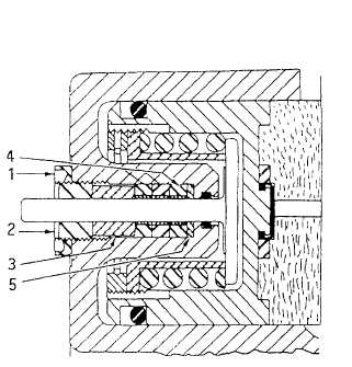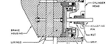 1. Locknut Figure 12-49.-Captured nontorquing-type automatic adjuster. clearance is worn from the face of the linings. With the adjusting nuts properly torqued, the friction between the grip and the adjusting pin is great enough to overcome the compression of the return spring, and the adjusting pin will be pulled through the grip only to compensate for lining wear. After torquing the automatic adjusting nuts to the specified value, back them off and retorque several times. This procedure will ensure proper mating of all parts and the correct torque on the final assembly. Figure 12-49 shows the captured nontorquing-type automatic adjuster used on some single and dual disc brake assemblies. Brakes that contain nontorquing adjusters can be identified by the locknut and threaded bushing over each adjusting pin. The only difference between the torquing-and nontorquing-type automatic adjustment is the method used to restrict the movement of the adjusting pin. The torquing-type adjustment uses a tapered grip, and the nontorquing uses one or more l/4-inch-wide grips composed of brass liners.