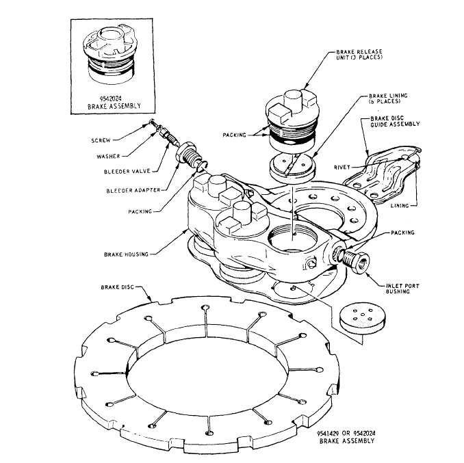 Figure 1250-Single disc brake-repair and parts replacement diagram. Spare grips are shipped with pilot pins installed to open the grip to the approximate diameter of the adjusting pin, thus preventing damage to the grjp during installation. The pilot pin is expelled as the grip is forced over the adjusting pin. If grips are to be reused when a brake is disassembled, they should have the pilot pins reinstalled before assembly in the brake. Brake repairs on the single disc brake consist of replacing linings, worn or damaged sealing devices, brake release units, or brake discs. See figure 12-50. Lining replacement and cure-date kit installation consist of the following steps: 1. Remove the lockwire and unscrew the cylinder heads (brake release units); remove the release units from the housing. 2. Remove the disc from the brake housing. 3. Remove the inlet plug and bushing, the bleeder adapter, and O-ring packings.