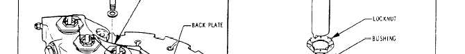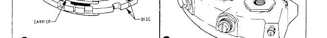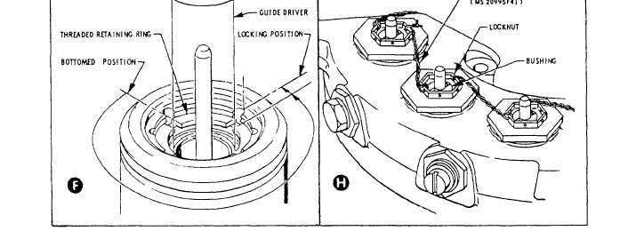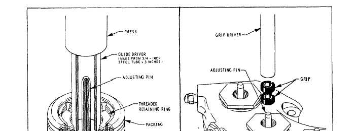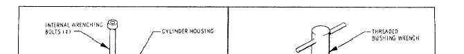 Figure 1252.-Seal replacement and piston return adjustment. Figure 12-52 shows the various steps involved in replacing the piston seals and adjusting the return mechanism. The internal wrenching bolts holding the cylinder housing to the carrier and backplate are removed (view A). The cylinder housing is placed under a press, as illustrated in view B. Use the press and the drive pin to force the adjusting pins through their grips and remove the pistons from the housing. Make sure that the drive pin is centered on the adjusting pinto prevent damaging the adjusting pin packings and grips. Next, cut the lockwire on the locknut. Use the threaded bushing wrench, illustrated in view C, to