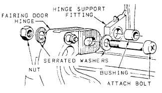 Figure 12-7.Adjustable door hinge installation. Landing gear doors have specific allowable clearances that must be maintained between doors and the aircraft structure or other landing gear doors. These required clearances can be maintained by adjusting the door hinges and connecting links and trimming excess material from the door if necessary.On some installations, door hinges are adjusted by placing the serrated hinge and serrated washers in the proper position and torquing the mounting bolts, which allows linear adjustments. Figure 12-7 shows this type of mounting. The amount of linear adjustment is controlled by the length of the elongated bolt hole in the door hinge. |