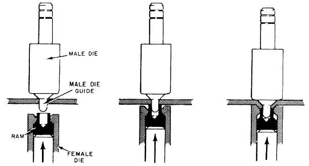 Dimple Countersinking Tools Dimple countersinking is accomplished by using male and female dies. The female die, shown in figure 13-14, contains a spring-loaded ram that flattens the bottom of the dimple as it is formed. This prevents cracks from forming around the dimple. The forming of a dimple is a combined bending and stretching operation. A circular bend is formed around the hole. As in any bending operation, the tension force at the upper side of the bend (break) creates the radius at the junction of the two surfaces-the top side of the sheet and the downward bent inner wall of the dimple depression. The stretch occurs around the hole as it is displaced from its original position and relocated at the bottom of the dimple. The female die must have a slightly larger cone diameter than the corresponding dimension of the male die. This allows for material thickness and relieves the bending load at the break in order to avoid circumferential cracks around the boundaries of the dimple. As a further safeguard, a slight radius is made on the female die at the junction of the top face with the dimple depression.Dimpling dies are made to correspond to any size and degree of countersunk rivet head available. The dies are numbered, and the correct combination of dies to use is indicated in charts specified by the manufacturer. Both male and female dies are machined accurately and have highly polished surfaces. When you dimple a hole, place the material on the female die and insert the male die in the hole to be dimpled. The dies are generally brought together, forming the dimple by a mechanical or pneumatic force.As newer aluminum alloys were developed to increase shear and tensile strength, they became more difficult to form, since these alloys are harder and more brittle. These aluminum alloys are subject to cracking when formed or dimpled cold. For this reason, it is necessary to use a hot dimpling process. The application of hot dimpling to the more brittle materials helps reduce cracking. The heat is applied to the material by the dies, which are maintained at a specific temperature by electrical heaters. The heat is transferred to the material to be dimpled only momentarily, and none of the heat-treat characteristics of the material are lost.There are several models of dimpling machines used in the Navy, from the bulky floor models to portable equipment. One of the most popular portable types is shown in figure 13-15. Basically, it has three units: the dimpling control unit, the dimpling squeezer, and the thermo dimple gun.The dimpling control unit is a small compact unit designed to regulate dimple die temperatures, prepressure, dwell time, and final forming pressure.