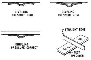 Figure 13-15.-Hot dimpling kit. This same unit is used with both the hot dimpling squeezer and the thermo dimple gun.The hot dimpling squeezer is designed for use where stationary squeezer operation is impractical or impossible. It is capable of working all material gauges up to and including 0.091 of an inch. The squeezer is designed to dimple in areas that are inaccessible to other types of equipment. Male and female dies are independently warmed by electrical heaters. The heaters produce a short heat-up and recovery time. The male die is adjustable to provide the maximum squeeze on all gauges of material. The unit also has a cooling feature.The thermo dimple gun is used to dimple in the center of panels and in those areas otherwise inaccessible to stationary dimpling equipment. When it is being used on the aircraft, the thermo dimple gun drives the dimple from the exterior while the female die and dolly bar are used on the inside. The thermo dimple gun is air cooled. This eliminates the need for cumbersome heat-resistant gloves. This tool is small, compact, well balanced, and easy to handle.Before adjusting the control unit for dimpling, you should refer to the equipment manufacturers dwell time chart. When you set up any dimpling equipment, follow the step-by-step procedure outlined in the operating and maintenance manual supplied with the equipment. Since equipment types vary, it is impractical to specify a standard procedure; however, there are four general requirements of a dimple, and by examining each, it is possible to denote improper setting up of equipment.1. Sharpness of definition. It is possible to get a dimple with a sharp break from the surface into the dimple. The sharpness of the break is controlled by two things: the amount of pressure and the material thickness.2. Condition of dimple. The dimple must be checked for cracks or flaws that might be caused by damaged or dirty dies, or by improper heating.3. Warpage of material. The amount of warpage may be held to a minimum if the correct pressure setting is held. When dimpling a strip with too much pressure, the strip tends to form a convex shape, as shown in figure 13-16. When insufficient pressure is used, it tends to form a concave shape. This can be checked by using a straight edge.