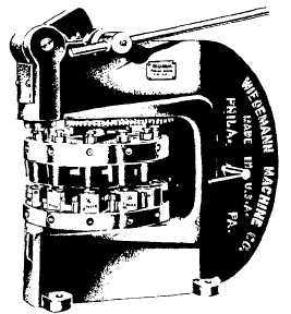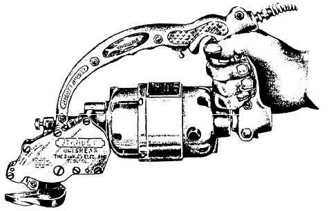 Figure 13-18.-Throatless shears. The hand bench shears operate similar to a paper cutter. They have one fixed blade and a movable blade, hinged at the back. They are similar to the throatless shears except the blades are straight and used only for straight cutting. Some bench shears have a punching attachment on the end of the frame opposite the shearing blades. This attachment is used to punch holes in metal sheets.To cut stock that is narrower in width than the length of the blades, the lever of the shears can be pulled all the way down. When you are cutting larger pieces, a series of short bites should be made.NOTE: Complete closing of the blade tends to tear the sheet at the end of each cut.Unishear Unishear is a trade name for a type of portable power shears. It is used for cutting curves and notches as well as straight-line cutting.This tool might be called power-operated, combination snips. It has two short blades. The lower blade is held in a fixed position. The upper blade moves up and down in short strokes at a high rate of speed. Its chewing motion is the basis for the widely used nickname of this power tool"nibbles." Figure 13-19 shows an 18-gauge Unishear.The cutting blades are easily removed for sharpening and replacement. The machine will cut as fast as it can be fed, up to 15 feet per minute. This is a ruggedly constructed machine; but for satisfactory performance, you must give it the best of care. It should be kept cleaned and oiled at all times.