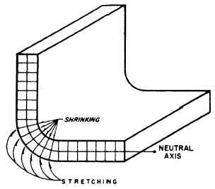 Figure 13-29.-Neutral axis. If it is impossible to obtain a straight edge on a sheet to start a layout or if the distance from the edge is too great, a reference line may be used. The reference line may be made by connecting any two points with a straight line. Perpendiculars may be erected to the reference line by using a compass or dividers. Once the perpendicular is accurately established, it may be used as a basis for almost any layout.A scriber must never be used for drawing lines on aluminum or magnesium except to indicate where the metal is to be cut or drilled. All other lines should be drawn with a soft-lead pencil. The pencil mark should be removed from aluminum and magnesium to prevent an electrolytic action that will eventually cause corrosion. It can be removed with isopropyl alcohol or MEK. If you fold a piece of metal along a sharp line made with a scriber, the scribed line will weaken the metal and possibly cause it to crack along the bend. If it does not crack at the time of bending, it is very susceptible to cracking at a later time when failure of the part could be dangerous. |