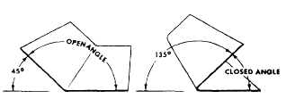 Figure 13-31.-Open and closed angles. end of the material can be most conveniently inserted in the brake. The bend line is then measured and marked with a soft-lead pencil from the bend tangent line closest to the end that is to be placed under the brake. This measurement should be equal to the radius of the bend. The metal is then inserted in the brake so that the nose of the brake will fall directly over the bend line. See figure 13-32.Bend tangent line. The line at which the metal starts to bend and the line at which the metal stops curving. All the space between the bend tangent lines is the bend allowance. Mold line. The line formed by extending the outside surfaces of the leg and the flange. (An imaginary point from which real base measurements are provided on drawings.) Base measurement. The base measurement is the outside dimension of a formed part. Base measurement will be given on the drawing or blueprint, or it may be obtained from the original part.