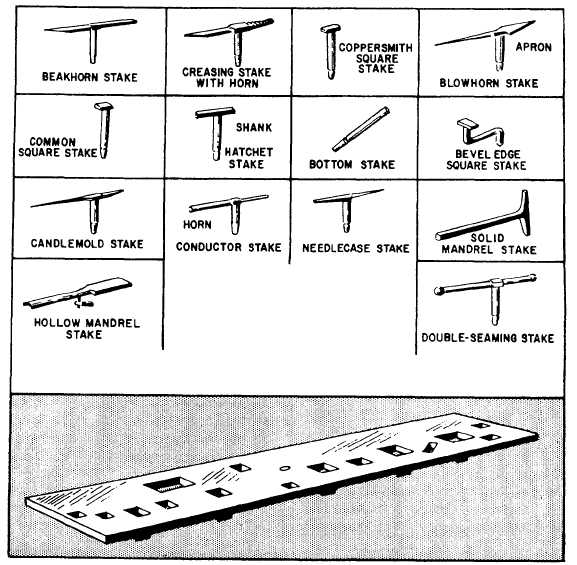 Figure 13-33.-Stakes and stake plate. formed by shrinking. Such parts are shaped with the aid of hardwood or metal form blocks. These blocks are made in pairs and specifically for the shape of the part being formed. Each pair conforms to the actual dimension and contour of the finished article.You should cut the material to be formed to size, allowing about one-quarter inch of excess material for trim. File and smooth the edges of the material to remove all nicks caused by the cutting tools. This reduces the possibility of the material cracking at the edges during the forming operation. Place the material between the form blocks and clamp it in a vise so that the material will not move or shift. Clamp the work as closely as possible to the particular area being formed to prevent strain on the form block and to keep the material from slipping.
