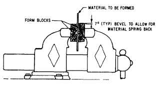 BENDING SHEET METAL Straight-line bends and folds in sheet metal are ordinarily made on the cornice brake and bar folder; however, a considerable amount of bending is also completed by hand-forming methods. Hand forming may be accomplished by using stakes, blocks of wood, angle iron, a vise, or the edge of a bench.Bending Over Stakes Stakes are used to back up sheet metal to form many different curves, angles, and seams. Stakes are available in a wide variety of shapes, some of which are shown in figure 13-33. The stakes are held securely in a stake holder or stake plate, which is anchored in a workbench. The stake holder contains a variety of holes to fit a number of different types of shanks.Although stakes are by no means delicate, they must be handled with reasonable care. They should not be used as backing when you are chiseling holes or notches in sheet metal.Bending in a Vise Straight-line bends of comparatively short sections can be made by hand with the aid of wooden or metal bending blocks. After the part has been laid out and cut to size, you should clamp it along the bend line between two form blocks, which are held in a vise. The form blocks usually have one edge rounded to give the desired bend radius. See figure 13-34. By tapping lightly with a rubber, plastic, or rawhide mallet, bend the metal protruding beyond the bending block to the desired angle.You should gradually make the bend even. Start tapping at one end and work back and forth along the edge. Continue this process until the protruding metal is bent to the desired angle. If a large amount of metal extends beyond the bending blocks, you should maintain enough hand pressure against the protruding sheet to prevent the metal from bouncing. Remove any irregularity in the flange by holding a straight block of hardwood edgewise against the bend and striking it with heavy blows of a hammer or mallet. If the amount of metal protruding beyond the bending blocks is small, make the entire bend by using the hardwood block and a hammer.Curved flanged parts have mold lines that are either concave or convex. The concave flange is formed by stretching, while the convex flange is