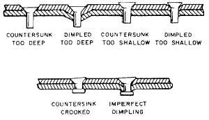 Figure 13-45.-Incorrect countersinking. The gun should be adjusted so the rivet can be driven in the shortest possible time, but you must take care not to drive the rivet so hard or in such a manner as to dimple the metal. Practice will enable you to properly adjust a gun for any type of work.The rivet should be pushed into proper position and held there firmly, with the set of the rivet gun resting squarely against the rivet head. The bucking bar is held firmly and squarely against the protruding rivet shank. (In most instances, the bucking bar must be manipulated by another person, called the "bucker.") The gunner then exerts pressure on the trigger and starts driving. The gun must be held tightly against the rivet head, and it must not be removed until the trigger has been released. The bucker removes the bucking bar and checks the upset head after the gunner has stopped driving. A signal system is usually employed to develop the necessary teamwork, and consists of tapping lightly against the work. One tap may mean "not fully driven, hit it again"; two taps may mean "good rivet"; three taps may mean "bad rivet, remove and drive another. "The upset head, often referred to as the bucktail, should be 1 1/2 times the original diameter of the shank in width and 1/2 times the original diameter in height, as shown in figure 13-46. If the head formed is narrower and higher than the dimensions given, more driving is necessary. If it is wider and shallower, it must be removed and replaced. |