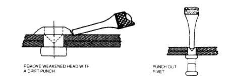 Figure 13-48.-Removal of rivets. Table 13-3.-Adjustments for CP350 Blind Rivet Pull Tool