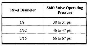 pressure is properly adjusted for the size rivets being driven. Also make sure that the rivets are of proper length. The tool has only one operating adjustment. This adjustment is used to control the pull on the pin. The desired amount of the pull depends on the diameter of the rivets to be installed. The pull is varied by changing the pressure at which the adjustable shift valve operates. To adjust the pressure, proceed as follows:1. Remove the pipe plug from the tool cylinder and connect a pressure gauge to the tool.2. Press the trigger and release it the instant a puff of exhaust indicates the shift valve controlling the inner anvil has shifted. The gauge will then indicate the shift pressure. See table 13-3 for the approximate pressures.NOTE: The trigger must be released immediately as the valve shifts. Otherwise the gauge will record the higher pressure that builds up after the valve has shifted.3. To adjust the pressure, loosen the valve-adjusting screw locknut and turn the valve-adjusting screw clockwise to increase pressure, or counter-clockwise to decrease pressure, until the desired pressure is obtained. Check the pressure after tightening the valve-adjusting screw locknut. When you drive rivets of extremely long grip length, you should make an adjustment to the high-pressure limit. For efficient operation of the tool, the minimum desired line pressure should be not less than 90 psi and the maximum not more than 110 psi. When you are using a CP350A or B rivet pull tool, it may be necessary to increase the inside diameter of the air inlet bushing, part number 81479, from 0.055 to 0.065 of an inch when you are driving 3/16-inch-diameter rivets, if the line pressure
