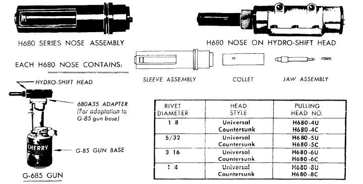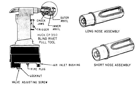 BLIND RIVET INSTALLATION The description and use of blind rivets are covered in chapter 2 of this manual. The special tools and installation and removal methods are covered in the following sections. Selection of the proper equipment depends on a number of variables: space available for equipment, type of rivets to be driven, and the availability of air pressure.Installation Tools One of the tools used for driving buck rivets is the CP350 blind rivet pull tool. See figure 13-49. The nose of the tool includes a set of chuck jaws that fit the pull grooves in the rivet pinto pull it through the rivet shank to drive the rivet. The nose also has an outer anvil that bears against the outer part of the manufactured head during the driving operation. The third nose component is an inner anvil that advances automatically to drive the locking collar home after the blind head is formed. A short nose assembly, interchangeable with the standard assembly, is available for use in areas of restricted clearance.A change in rivet diameter requires a change in chuck jaws, outer anvil, inner anvil, and inner anvil thrust bearing, and an adjustment of the shift valve operating pressure. A change in the rivet head type from universal head to countersunk head without a change in rivet diameter, or vice versa, requires only a change of the outer anvil. A special chuck jaw assembly tool is furnished with the tool. To insert the chuck jaws into the chuck sleeve, you should mount the three jaws on this assembly tool to form a cone. Then lower the inverted chuck sleeve over the jaws. You should always be sure that the pull tool is equipped with the correct size chuck jaws, the outer and inner anvils fit the rivets being driven, and the relief valve operating