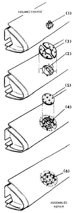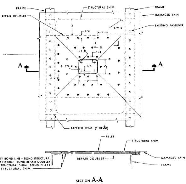 Figure 13-62.Flush patch over internal structure. clear of internal structure, except for modification of the doubler.CHEM-MILLED SKIN REPAIR. On some aircraft the fuselage skin is Chem-Milled or machine tapered and highly stressed. Figure 13-63 shows a Chem-Milled skin repair in a pressurized fuselage section. The skin consists of a shim, a doubler, and a filler. The damage area is trimmed and the inside corners are filed to one-fourth of an inch in radius. The replaced metal and rivets or other fasteners must be equal to or stronger than the original. The structural repair manual should be consulted for fastener spacing, edge distance, and repair procedure. During final assembly of the repair, the fabricated parts should be bonded together with an adhesive to ensure pressurization is maintained.FLUSH ACCESS DOOR. A flush access door installation, as shown in figure 13-64, is sometimes permitted. It is installed to make repair to the internal structure easier and to permit repair of damage to the skin in certain areas. The flush access door consists of a doubler and a stressed cover plate. The cover plate is normally fabricated from material identical to the skin. A single row of nut plates is riveted to the doubler. The doubler is then riveted to the interior side of the skin with two rows of rivets, staggered as shown in figure 13-64. The cover plate is attached to the doubler with machine screws. When an access