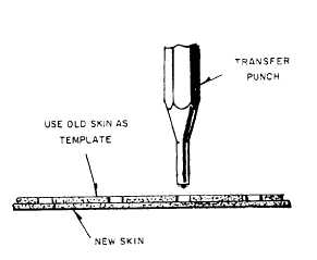 Figure 13-65.-Transferring rivet holes. may be determined in either of two ways. The dimensions can be measured during the inspection, or the old skin can be used as a template for the layout of the sheet and the location of the holes. The second method is preferable and more accurate. Regardless of the method used, the new sheet must be large enough to replace the damaged area, and it may be cut with an allowance of 1 to 2 inches of material outside the rivet holes.If the old sheet is not too badly damaged, it should be flattened and used as a template. The new sheet, having been cut approximately 1 inch larger than the old, should then be drilled near the center of the sheet by using the holes in the old sheet as a guide. The two sheets are then fastened together with sheet metal fasteners. The use of sheet metal screws is not recommended since they injure the edge of the rivet holes. The drilling should proceed from the center to the outside of the sheet. You should insert sheet metal fasteners at frequent intervals.If it is impossible to use the old sheet as a template, the holes in the new sheet should be drilled from the inside of the structure. Use the holes in the reinforcing members as guides, and insert fasteners at frequent intervals. This process is called back-drilling.Before you place the new sheet on the framework to drill the holes, make certain that the reinforcing members are aligned and flush at the points at which they intersect; otherwise, the holes in the new sheets will not be accurately aligned. For the same reason, the new sheet should have the same contour as the old before drilling the rivet holes. To duplicate holes from reinforcing members to the skin, you must exercise extreme care or both frame and skin will be ruined. Since most bulkheads, ribs, and stringers depend on the skin for some of their rigidity, they can easily be forced out of alignment in the drilling process. The skin must be held firmly against the framework, or the pressure from the drilling will force it away from the frame and cause the holes to be out of alignment. This may be overcome by placing a block of wood against the skin and holding it firmly while the drilling progresses. Also, make sure that the drill is held at a 90-degree angle to the skin at all times, or the holes will be elongated and out of alignment. When you drill through anchor nuts, a smaller pilot drill should be used first. You must use care so as not to damage the anchor nut threads. The pilot holes are then enlarged to the proper size.It maybe necessary to use an angle attachment or flexible shaft drill in places where it is impossible to insert a straight drill. In case neither type can be inserted, the new section should be marked carefully with a soft pencil through the holes in the old section. Another method of marking the location of the new holes is to use a transfer or prick punch, as shown in figure 13-65. Center the punch in the old hole, and then tap the punch lightly with a hammer. The result should be a mark that will serve to locate the hole in the new sheet.Still another way to locate the rivet holes without a template is to use a hole finder similar to the one shown in figure 13-66.
