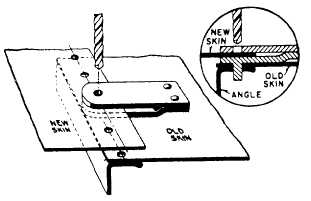 of the entire panel. As in all other forms of repairs, the first step is to inspect the damaged area thoroughly to determine the extent of the damage. Inspect the internal structure for damage or signs of strain. Members that are bent, fractured, or wrinkled must be replaced or repaired. They may be sheared considerably without visible evidence of such a condition. You should drill out rivets at various points in the damaged area and examine them for signs of shear failure.During the inspection, note carefully all unusual riveting problems or conditions that render riveting difficult or make rivet replacement impossible. Any fixtures that will hinder riveting and prevent the use of straight bucking bars will be apparent in a thorough inspection. There will also be places where flanges or reinforcing members, intersection of stringers, longerons, formers, frames, or rings make the bucking of rivets very difficult. This problem can be solved by designing and making bucking bars to suit these particular situations.You must take care to avoid mutilating the damaged skin in the removal process. In some cases, it can be used as a template for the layout and the drilling of holes in the new piece of skin.The rivet holes in stringers, longerons, bulkheads, formers, frames, rings, and other internal members must be kept in the best condition possible. If any of these members are loosened by the removal of rivets, their location should be marked so they can be returned to their original position.You should refer to the applicable repair material chart in the aircraft structural repair manual for the gauge and alloy of material to be used for the replacement panel. The size and shape of the panel