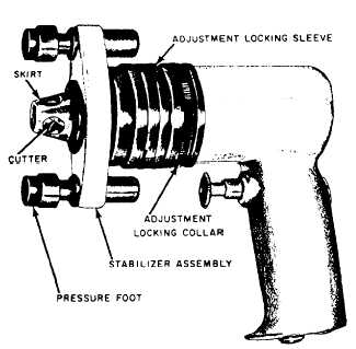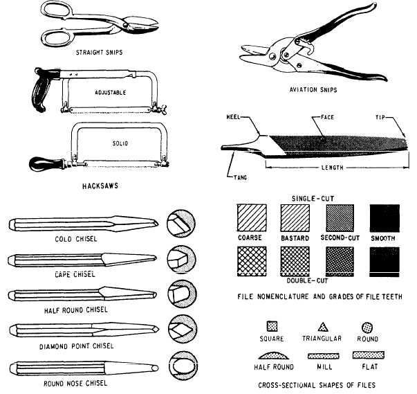Snips and Shears Snips and shears are used for cutting sheet metal and steel of various thickness and shapes. Normally, the heavier or thicker materials are cut by shears. One of the handiest tools for cutting light (up to 0.064 inch thick) sheet metal is the hand snip (tin snips). The straight snips, shown in figure 13-8, have blades that are straight and cutting edges that are sharpened to an 85-degree angle. Snips like this can be obtained in different sizes ranging from the small 6-inch to the large 14-inch snip. Tin snips will also work on slightly heavier gauges of soft metals, such as aluminum alloys.It is hard to cut circles or small arcs with straight snips. There are snips especially designed for circular cutting. An example is the aviation snips that are available in a left-hand and right-hand cutting design. To cut large holes in the lighter gauges of sheet metal, start the cut by punching or otherwise making a hole in the center of the area to be cut out. With aviation snips, make a spiral cut from the starting hole out toward the scribed circle, and continue cutting until the scrap falls away.This part of the chapter is devoted to the common types of air-driven power tools that you will use on a routine basis. You should pay attention to the safety procedures, general operating procedures, and care of these tools.