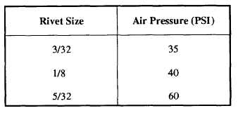 Pneumatic Riveters Rivet guns vary in size and shape and have a variety of handles and grips. Nearly all riveting is done with pneumatic riveters. The pneumatic riveting guns operate on compressed air supplied from a compressor or storage tank. Normally, rivet guns are equipped with an air regulator on the handle to control the amount of air entering the gun. See figure 13-10. Regulated air entering the gun passes through the handle and throttle valve, which is controlled by the trigger, and into the cylinder in which the piston moves. Air pressure forces the piston down against the rivet set and exhausts itself through side ports. The rivet set recoils, forcing the piston back. Then the cycle is repeated. Each time the piston strikes the rivet set, the force is transmitted to the rivet. Rivet sets come in various sizes to fit the various shaped rivet heads. Rivet set retainer springs must be used on all pneumatic rivet sets to prevent the set from being discharged from the gun when the trigger is pulled. Several types of pneumatic riveters are in general use. They are the one-shot gun, slow-hitting gun, fast-hitting gun, corner riveter, and the squeeze riveter. See figure 13-11. The type of gun used depends on the particular job at hand, with each type having its advantages for certain types of work. Small parts can be riveted by one person if the part is accessible for both bucking and driving. The greater part of riveted work, however, requires two people.Rivet Guns The size and the type of gun used for a particular job depend upon the size and alloy rivets being driven and the accessibility of the rivet. For driving medium-sized, heat-treated rivets that are in accessible places, the slow-hitting gun is preferred. For small, soft alloy rivets, the fast-hitting gun is preferable. There will be places where a conventional gun cannot be used. For this type of work, a corner gun is employed.Larger rivets require greater air pressure. The approximate air pressures for four of the most common rivet sizes are given in table 13-1.Table 13-1.-Approximate Air Pressure for Rivet Guns